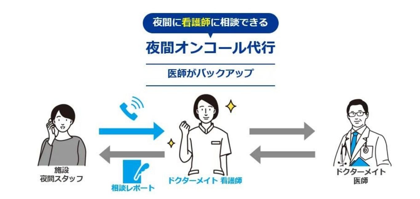 介護施設の看護師に代わって当社の看護師が夜間オンコールの対応を行うドクターメイトの夜間オンコール代行サービスは、申し送りや救急搬送時の連絡票としても利用可能なレポートも提供するほか、24時間体制で専任医師がサポートするので急な医療ニーズにも適格なアドバイスを提供。